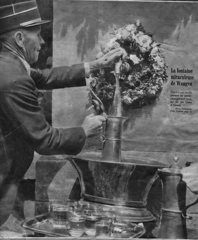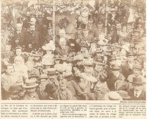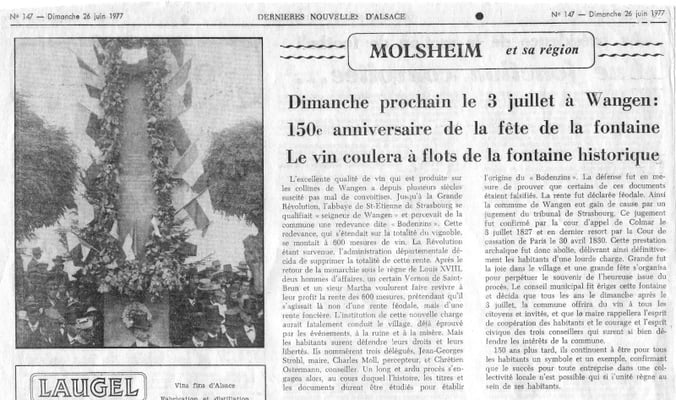 La prestation abusive était abolie, et la joie fut immense dans notre village. Pour perpétuer le souvenir de cette heureuse issue du procès, le Conseil municipal de l’époque fit ériger une fontaine et décida que tous les ans, le 3 juillet, si c'est un dimanche, ou le dimanche suivant le 3 juillet, la commune offrirait du vin à tous les citoyens et invités. Il fut également décidé que chaque année, le Maire rappellerait l’histoire, mais aussi la ténacité et l’esprit civique des trois conseillers qui ont défendu corps et âme la cause de WANGEN.