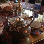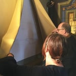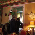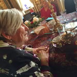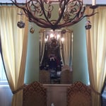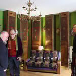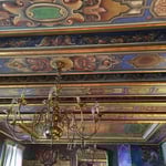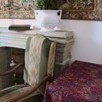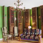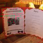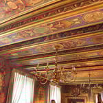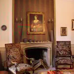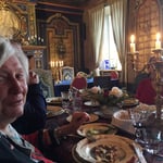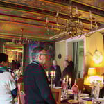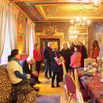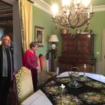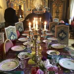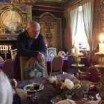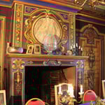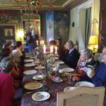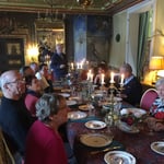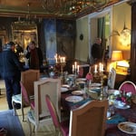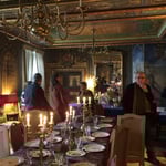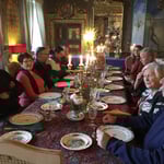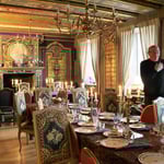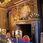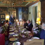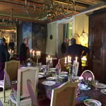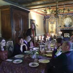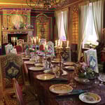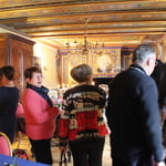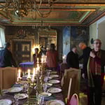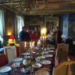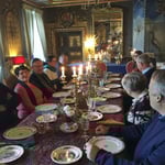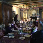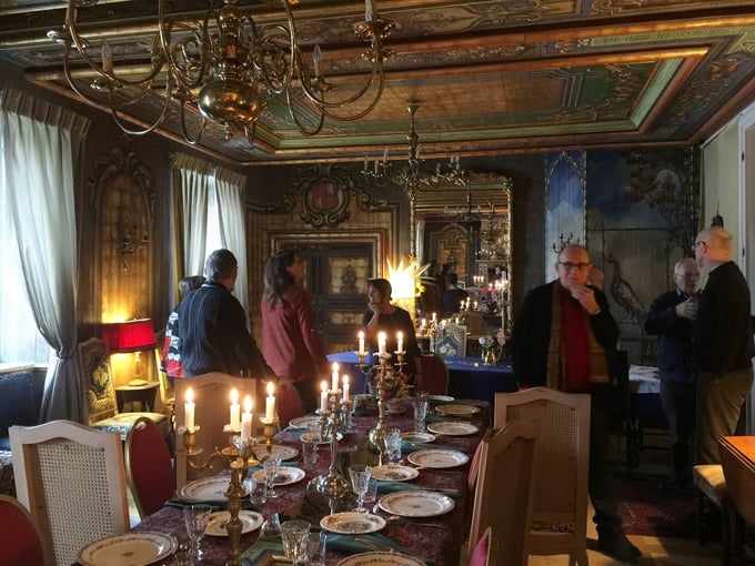 Après l’apéritif pris dans l’un des petits salons très joliment meublés, M. Pascal, tel un parfait maître de cérémonie, nous fait entrer dans la magnifique salle à manger du château. Et là, quelle surprise, quel ravissement devant tant de beautés réunies ! Un plafond peint dans des tons vieil or, brun, vert olive, des boiseries décorées dans les mêmes tons, des tentures, des double-rideaux, le tissu des chaises assorti à la nappe, des chandeliers avec des bougies allumées, un service de table étincelant…Nous ne savions plus où poser notre regard !