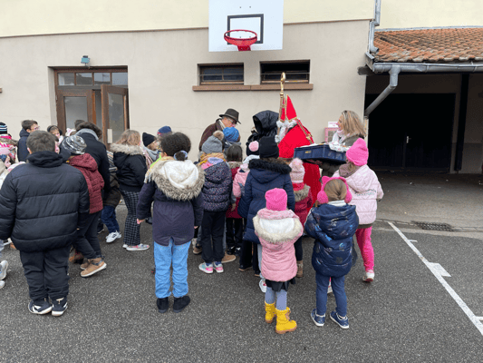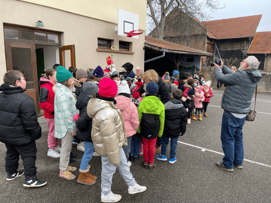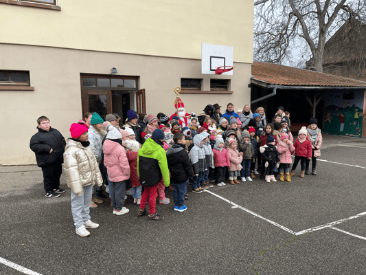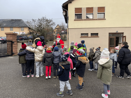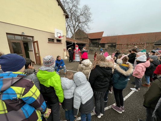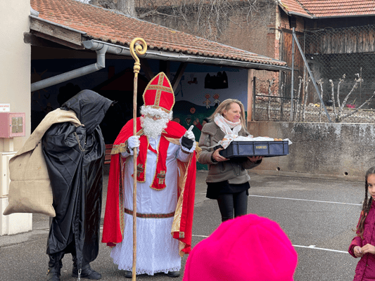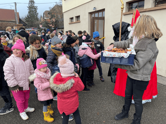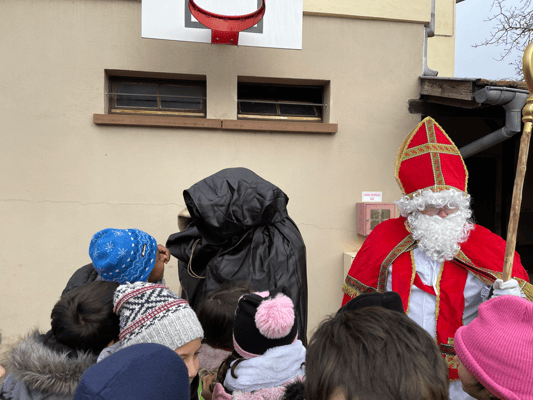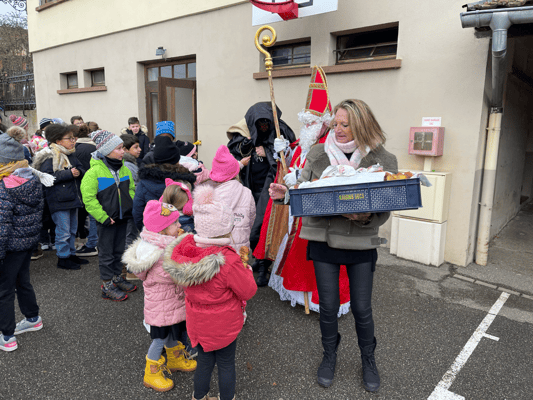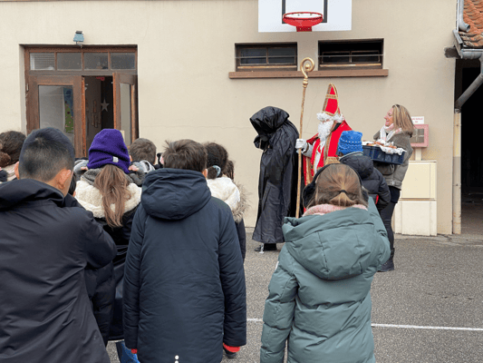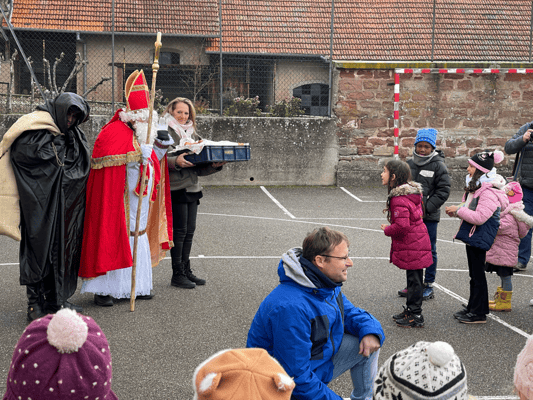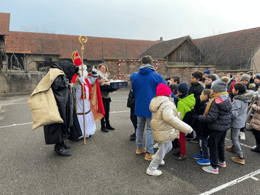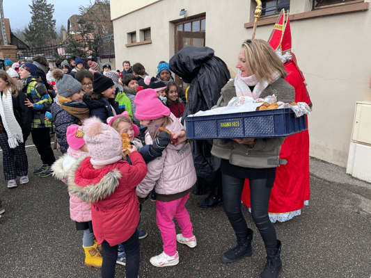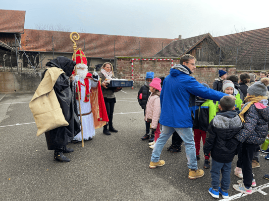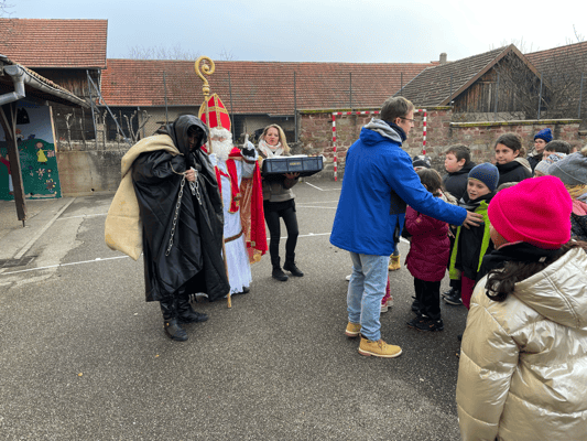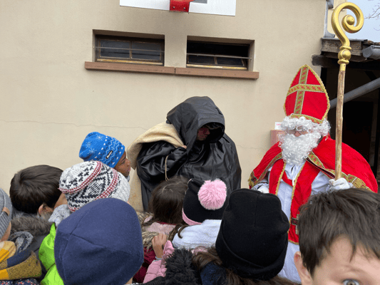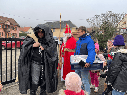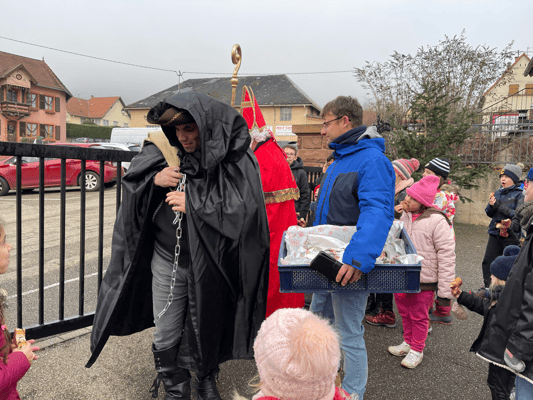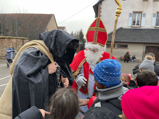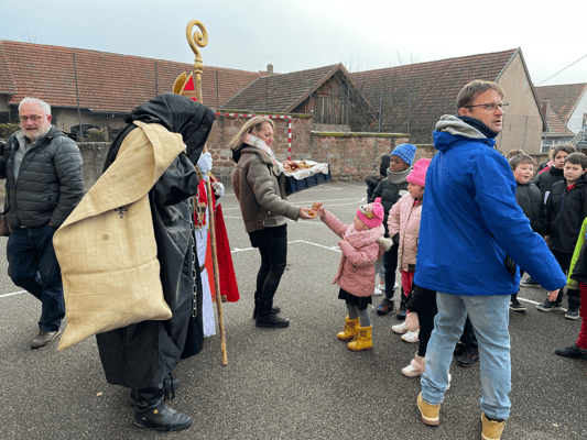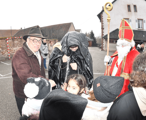 Le deuxième jour, St Nicolas avait rdv avec les enfants de l’école de Wangen. Il était accompagné de Hans Trapp qui s’est penché avec attention sur le comportement de certains petits écoliers.Tous les enfants ont eu droit à un mannele