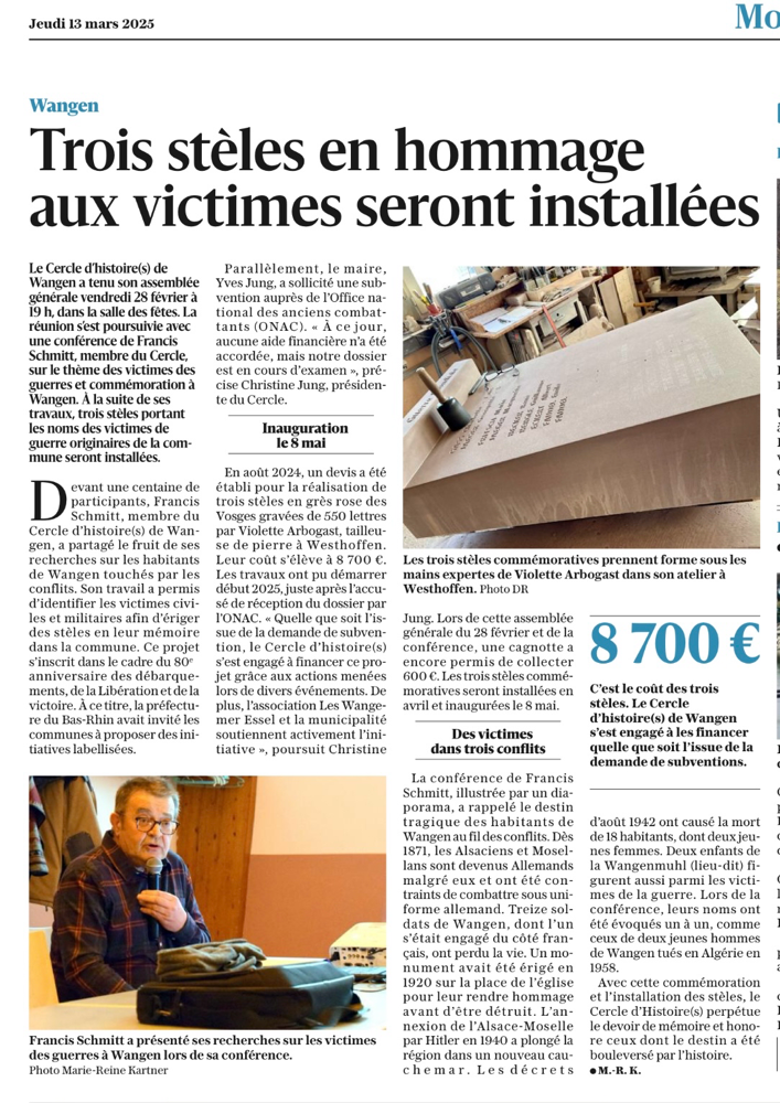 La partie statutaire sera suivie d' une conférence de Francis Schmitt qui nous présentera son travail de recherche sur les victimes de guerres et une commémoration à Wangen..