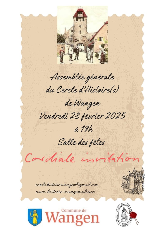 Le cercle d'Histoire(s) a le plaisir de vous convier à son assemblée générale publique le vendredi 28 février à 19h, salle des fêtes de Wangen où nous ferons le bilan de l'année 2024 et le tour des projets et animations 2025 de l'association dans le village.