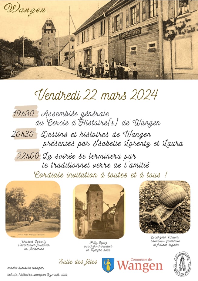 Le cercle d'Histoire(s) a le plaisir de vous convier à son assemblée générale publique le vendredi 22 mars à 19h30, salle des fêtes de Wangen où nous ferons le bilan de l'année 2023 et le tour des projets et animations 2024 de l'association dans le village. La partie statutaire sera suivie d' une intervention d'Isabelle Lorentz , originaire de Wangen qui nous présentera ses textes et ses photos concernant le destin bien particulier de deux de ses ancêtres du village. Sa petite fille...