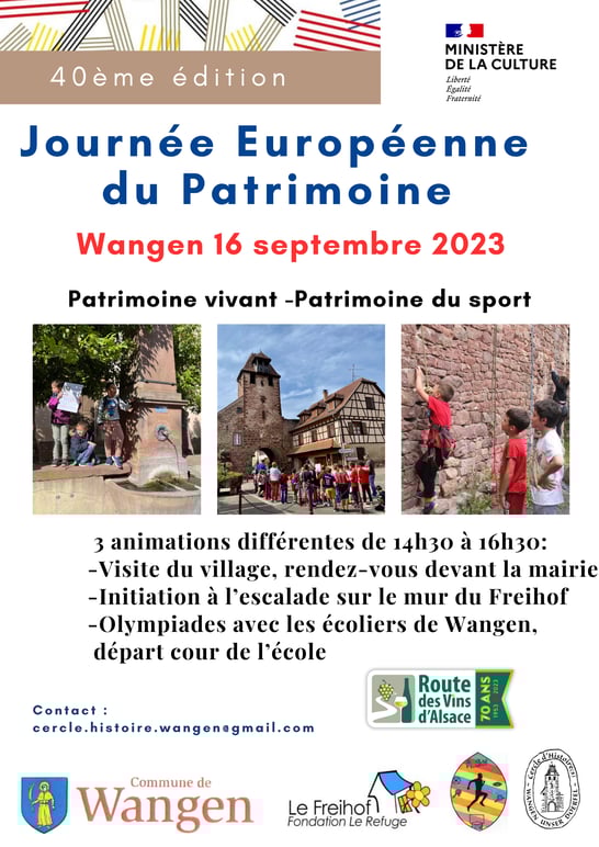 A Wangen, le cercle d'Histoire(s) fait chaque année le choix de privilégier le samedi des journées européennes du patrimoine pour vous proposer une manifestation afin de pouvoir à son tour visiter d'autres lieux, ailleurs, le dimanche. Le samedi 16 septembre, d'autres associations de Wangen se joignent à nous pour vous proposer un programme sur trois niveaux pour petits et grands en rapport avec le thème national "Patrimoine vivant-Patrimoine du sport." Venez à notre rencontre pour...