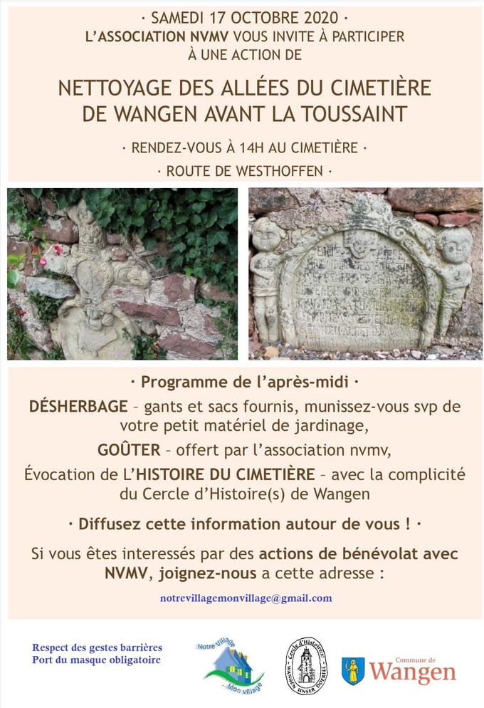 L 'association Notre Village Mon Village propose une action de nettoyage des allées du cimetière de Wangen avant la Toussaint. Rendez- vous samedi 17 octobre à 14h au cimetière, route de Westhoffen, dans le respect des gestes barrières. Au programme de l'après-midi , désherbage, goûter et évocation de l'Histoire du cimetière. Partageons cette action citoyenne et mutualisons nos énergies !