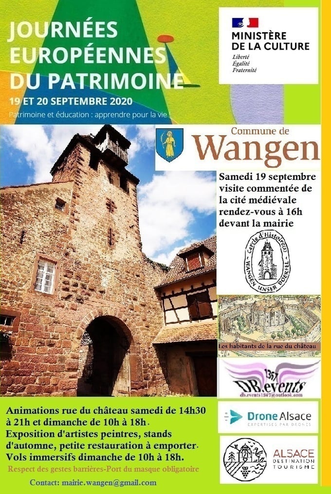 Les 37e journées européennes du patrimoine auront lieu les 19 et 20 septembre 2020, autour du thème : « Patrimoine et éducation : apprendre pour la vie ! ». A Wangen, les habitants de la rue du château et le cercle d'Histoire(s) participent à l'événement en partenariat avec la commune. Des animations seront proposées le samedi de 14h30 à 21h et le dimanche de 10h à 18h rue du château ; exposition d'artistes peintres, stands d'automne, petite restauration à emporter. Le samedi le...