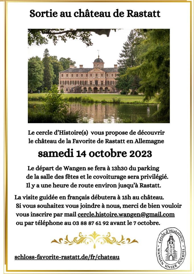 Comme convenu à la dernière réunion de bureau du cercle d'Histoire(s), nous lançons les inscriptions pour la visite du château de Rastatt qui aura lieu le samedi 14 octobre. Vous trouverez les informations principales sur le visuel ci-dessus. Vos réponses sont attendues avant le 7 octobre minuit ! Nous ouvrons bien entendu les inscriptions à tous nos membres et sympathisants. A très bientôt !
